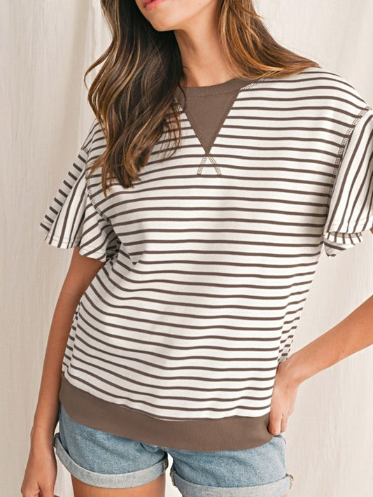 Striped Ruffle Sleeve Round Neck Cotton Top