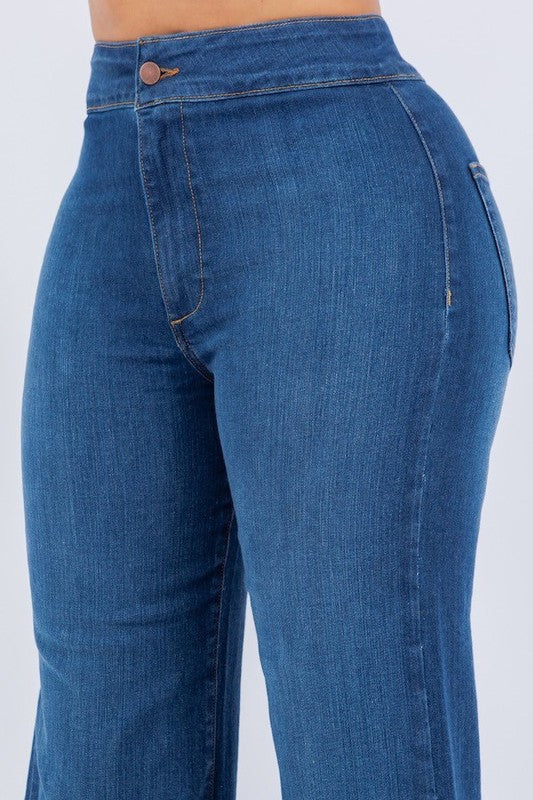 Get ready to meet your new favorite jeans: the Harley Wide Leg! Combining style and comfort like never before, these denims feature a stretchy premium fabric, a wide waistband, and a unique medium wash. With a front button and zipper closure, back pockets, and a wide hem detail, these jeans have it all. Best part? They're made right here in the USA and come in a perfect 34" inseam. Say hello to your new go-to jeans!